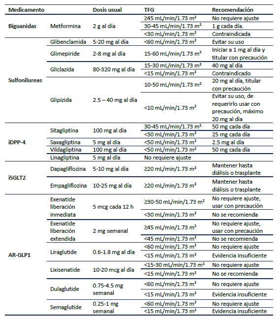 El beneficio de los iSGLT-2 en ERC está dado por disminución en la caída de la tasa de filtración glomerular, además, disminuyen la proteinuria y la progresión a ERC-G5 10,11,31,35-38. En caso de no lograr el control glucémico se debe considerar añadir a la terapia los AR-GLP1 por disminución de la macroalbuminuria 39, desenlace que se correlaciona con mayor riesgo cardiovascular 40). Además, en el arsenal terapéutico de los pacientes con DT2 y albuminuria debe estar el uso del antagonista del receptor mineralocorticoide no esteroideo finerenone 34, pues en el estudio FIDELIO-DKD (41 y FIGARO-DKD (42 se demostró como este medicamento disminuye la progresión de ERC y eventos cardiovasculares. En la Tabla 4 se representan las dosis de los medicamentos según la TFG.