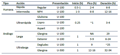 La terapia con insulina debe comenzar con insulina basal a dosis de 0.1 - 0.2 UI/Kg/día o 10 UI/día y titular 10 - 15% o 2 - 4 UI cada 3 días 3, teniendo como meta una glucemia en ayunas entre 80 - 130 mg/dL3. En caso de que no se logre la meta o si se identifica un patrón de hiperglucemia postprandial (glucometría > 180 mg/dL 2 horas luego de la ingesta), se debe instaurar un esquema basal plus en el cual se agrega un bolo de insulina de acción rápida con la comida principal, a dosis de 4 UI o 0.1 UI/kg 3. Si a pesar de esto no se logran metas, se debe implementar un esquema basal bolo en el cual se agregan 2 o más bolos de insulina de acción rápida a la misma dosis de lo anteriormente mencionado o según conteo de carbohidratos en caso de que el paciente esté entrenado para esto. Se debe titular la dosis hasta lograr meta de glucemia 2 horas postprandial <180 mg/dL 3. En la Tabla 5 se describen las insulinas disponibles en Colombia.