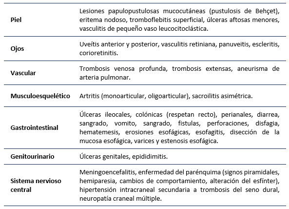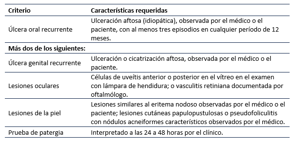 No se ha descrito alguna prueba diagnóstica que sea patognomónica de la enfermedad 2, por lo que el diagnóstico recae en una anamnesis extensa, hallazgos al examen físico, histopatología y pruebas complementarias. Por tal motivo, el Grupo de Estudio Internacional para la Enfermedad de Behcet, ha definido los criterios clasificatorios basados en hallazgos clínicos (Tabla 2 4).