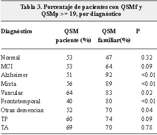 Es significativamente mayor la prevalencia de percepción de tratarse de un problema de memoria cuando quien reporta es el familiar que cuando es referida por el paciente, en todas las demencias, y no se encuentra una diferencia estadísticamente significativa en los pacientes identificados como normales, deterioro cognoscitivo leve(MCI), en los trastornos de ánimo y otros trastornos psiquiátricos (Tabla 3).