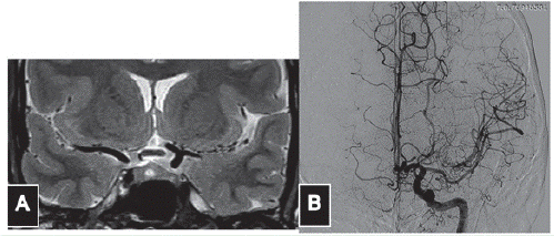 Figura 1 Imagen de resonancia magnética donde se observa una configuración anómala de la porción M1 de la arteria cerebral media izquierda. (A). Angiografía cerebral donde observamos ausencia del tronco superior de M2 luego de la bifurcación (B).