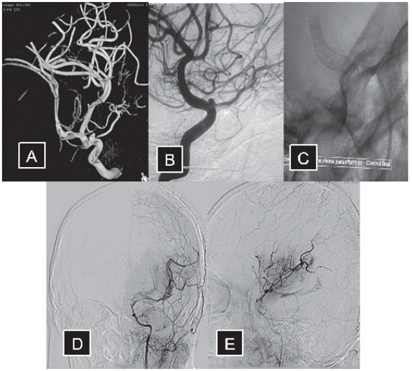 Paciente femenina de 32 años, quien consultó por crisis de cefalea inespecífica que hacía pensar en un patrón migrañoso; sin antecedentes personales importantes, no hipertensa ni fumadora. En una angioresonancia se encontró imagen de aneurisma del sifón carotídeo izquierdo paraoftálmico de 6 mm y cuello ancho. Se llevó a procedimiento endovascular y se le implantó un stent desviador de flujo (figura 2a). El control angiográfico a los 6 meses reveló una estenosis significativa de ACM secundaria a hiperplasia endotelial (figura 2b). Un año después una angiografía mostró un claro patrón de Moyamoya como respuesta a una severa estenosis del segmento M1 de las ACM (figura 2c). La paciente permaneció asintomática en todo momento, libre de molestias que sugirieran fenómenos isquémicos o hemorrágicos.