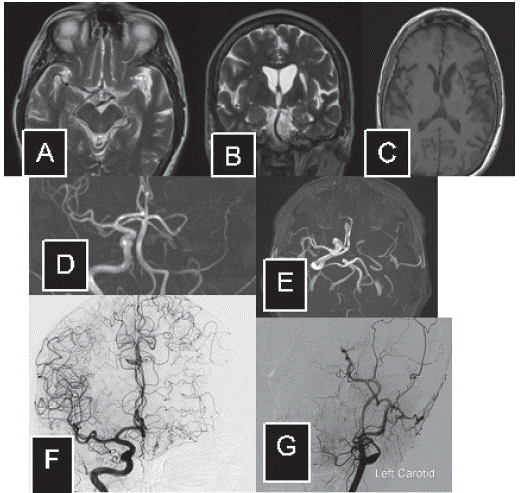 Figura 3 Imágenes de resonancia magnética (A-B-C-D): se evidencia infarto frontal antiguo y ausencia de señal en el territorio de la arteria cerebral media y arteria comunicante anterior del lado izquierdo. Panangiografía a cerebral (E-F-G): reconstitución de la circulación del hemisferio izquierdo a expensas de ramas lenticuloestriadas neoformadas y circulación colateral.
