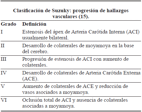 En uno de los casos que reportamos, la paciente tenía como enfermedad de base una neurofibromatosis tipo 1 y un patrón de Moyamoya en las imágenes realizadas. Creemos que, compartiendo un fenotipo similar pueden tener una patogénesis común en la oclusión vascular y el desarrollo de vasos colaterales. Consideramos que en nuestra paciente, y probablemente en otros reportados en la literatura, dicho patrón vascular se deba a la presencia de un fenómeno isquémico crónico dado por la oclusión de los vasos proximales al polígono de Willis. Esto llevaría al desarrollo de vasos adyacentes colaterales en la fase intermedia y anastomosis transdurales o transóseas entre la carótida interna y externa en fases tardías. Todo esto como un mecanismo compensatorio en un esfuerzo por suplir de oxígeno y nutrientes a un cerebro enormemente dependiente. Las nuevas arterias llamadas vasos de Moyamoya, atraviesan los ganglios basales y el tálamo, suministrando un flujo colateral a las áreas distales hipoperfundidas 6,14. En algún momento de la evolución, el neosistema vascular se hace incompetente y la vasculopatía progresa, tal como lo evidencia la clasificación de Susuki (tabla 1), a tal punto de hacerse sintomática.