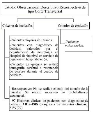Se llevó a cabo un estudio de corte transversal para describir los principales hallazgos en imágenes cerebrales (tomografía cerebral y resonancia magnética cerebral), así como demográficos y clínicos en pacientes con delirium. La población base fueron los pacientes atendidos por el departamento de neurología en un hospital de alta complejidad en la ciudad de Bogotá, Colombia entre octubre del 2015 y octubre del 2016 (Figura 1). No se hizo el cálculo de tamaño de la muestra, sino que se tomó el total de la muestra en un periodo de un año, así: pacientes mayores de 18 años con diagnóstico de delirium valorados por el departamento de neurología en urgencias u hospitalización; se excluyeron pacientes embarazadas.
