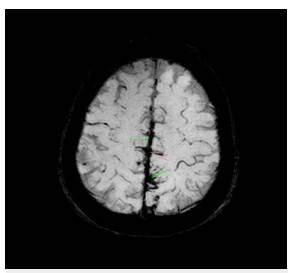 Figura 1: Secuencia de susceptibilidad magnética por resonancia. Muestra contenido hemático en el espacio subaracnoideo.