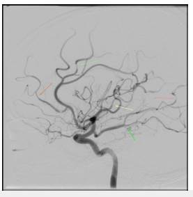 Teniendo en cuenta la presentación clínica, los hallazgos angiográficos dados por la ausencia de signos de arrosariamiento vascular, la presencia de estrechez y dilatación vascular segmentaria, la carencia de manifestaciones sistémicas de enfermedad reumatológica, y la no exposición a medicamentos vasoactivos, inmunosupresores u otra etiología; se consideró con más certeza el síndrome de vasoconstricción cerebral reversible desencadenado por maniobras de Valsalva. Para el diagnóstico diferencial de la angiitis primaria del sistema nervioso central se realizó punción lumbar para descartar inflamación en el líquido cefalorraquídeo; la presión de apertura fue de 25 cmH2O, glucorraquia 57 mg/dl (glucemia 74,9 mg/dl), proteinorraquia 32 mg/dl, leucocitos 6 células/µl, VDRL no reactivo. Se observó a la paciente durante 14 días en la institución, en este periodo la cefalea resolvió y no hubo recurrencia, tampoco hubo síntomas o signos nuevos; los estudios de doppler transcraneal de seguimiento no mostraron vasoespasmo. A la salida estaba asintomática y sin secuelas neurológicas, completando 3 semanas de tratamiento con nimodipino. A los 3 meses el control angiográfico mostró normalización de la estrechez segmentaria vascular (Figuras 3 a 4).