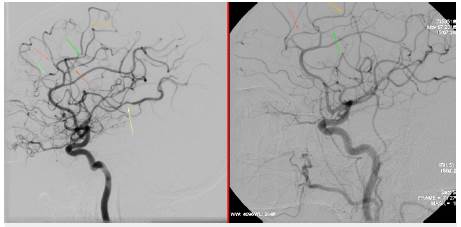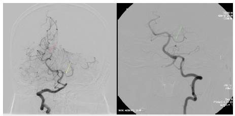 Figura 3: Arteriografía de la carótida interna derecha. A la izquierda el estudio inicial muestra constricción arterial segmentaria (signo de "salchichas atadas") en ramas de las arterias cerebrales anterior y media. A la derecha el estudio control a los 3 meses muestra normalización de los hallazgos (ver flechas).