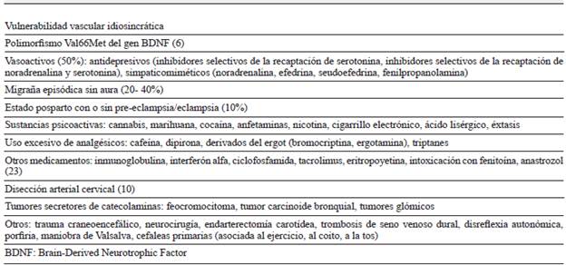 Hacia 1960 se pensaba que los casos de vasoconstricción cerebral reversible relacionados con puerperio, migraña y uso de vasoactivos eran entidades diferentes y se trataban de forma independiente; fue hasta 1988 que Gregory Call y Marie Fleming describieron una nueva entidad nosológica a partir de la caracterización de una serie de pacientes con hallazgos clínicos similares de cefalea hiperaguda, déficit neurológico transitorio o permanente, líquido cefalorraquídeo (LCR) normal o con alteración inespecífica, y vasoconstricción arterial segmentaria 1-3. En 2007, Calabrese et al proponen el término "síndrome de vasoconstricción cerebral reversible" (SVCR) abarcando lo que previamente se conocía como síndrome de Call-Fleming, angiopatía posparto, angiopatía inducida por medicamentos y vasoespasmo migrañoso 1,4 El SVCR tiene una edad media de presentación de 45 años, pero en las mujeres es más usual hacia los 50 años 5. La fisiopatología es desconocida, pero se cree que hay un trastorno reversible de la regulación del tono arterial intracraneal relacionado con hiperactividad simpática, disfunción endotelial y estrés oxidativo 1,5. En la histopatología de pacientes con SVCR no se han encontrado cambios en los vasos cerebrales que sugieran procesos inflamatorios activos o vasculíticos 1. Existen factores hormonales, bioquímicos y genéticos relacionados con la entidad como: estrógeno, endotelina-1, serotonina, óxido nítrico, prostaglandinas, factor de crecimiento placentario, receptor soluble del factor de crecimiento placentario, endoglobina soluble y el polimorfismo Val66Met del gen del BDNF (Brain-Derived Neurotrophic Factor) 1,6 . Aproximadamente en 50% de los casos se identifican desencadenantes (Tabla 1) y el tiempo entre la exposición y el desarrollo del SVCR puede ser desde unos días a meses 5,7 . La asociación del SVCR y la maniobra de Valsalva se ha postulado dada la potencial inducción de activación simpática, sin embargo, es usual que existan otros factores con un mayor potencial etiológico los cuales deben ser buscados y evaluados, antes de determinar que dicha maniobra ha sido la causa 8.