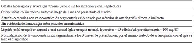 La característica clínica principal es el inicio en segundos de una cefalea intensa, que puede ser bilateral y difusa, o de localización occipital (94-100%), imitando al dolor producido por la ruptura de un aneurisma sacular; puede estar asociado a emesis, diplopia, hipertensión arterial y fotosensibilidad. Aunque la cefalea tipo trueno no es específica del SVCR (45% de los casos) 8,9, la ausencia de dolor es inusual. Otras presentaciones incluyen crisis epilépticas (17%), encefalopatía, déficit neurológico focal (8%), ataque cerebrovascular, edema cerebral, disección arterial cervical 1,10. El examen físico usualmente es normal o se pueden documentar signos de focalización 11. El citoquímico del LCR generalmente es normal, pero puede tener cambios inespecíficos como pleocitosis menor a 15 células/µl y proteínas menor a 100 mg/dl 11,12 (Tabla 2) 4. Es mandatoria la realización de imágenes diagnósticas para demostrar la vasoconstricción segmentaria y evaluar los diagnósticos diferenciales, así como buscar complicaciones 12. En la resonancia magnética cerebral las lesiones se observan en 12-81% incluyendo hemorragia subaracnoidea de la convexidad, hemorragia intraparenquimatosa e infarto cerebral 11. La panangiografía es la mejor herramienta de diagnóstico para confirmar la estenosis segmentaria vascular 7; la sensibilidad de los métodos indirectos de angiografía es del 70% con respecto a la técnica convencional 11. Hasta un tercio de los pacientes pueden no evidenciar la vasoconstricción en la primera semana 12, los cambios pueden verse en los controles imagenológicos posteriores entre uno y tres meses después 13. La ultrasonografía es una herramienta útil en el seguimiento del vasoespasmo 12, es poco frecuente encontrar anormalidades (13% de los pacientes) pero su hallazgo predice riesgo de complicaciones 13,14.