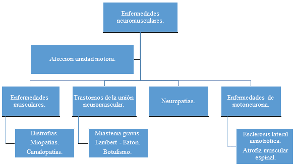 Por otro lado, los trastornos neuromusculares, constituyen un grupo heterogéneo de enfermedades genéticas o de origen inmunológico que afectan a todos los grupos etários. Estos trastornos incluyen enfermedades musculares (distrofias, miopatías congénitas, metabólicas e inflamatorias y canalopatías), trastornos de la unión neuromuscular (síndromes miasténicos adquiridos y congénitos) así como trastornos de los nervios periféricos (neuropatías autoinmunes, metabólicas y genéticas) y enfermedades de motoneurona (esclerosis lateral amiotrófica y atrofia muscular espinal) 6. En la figura 1, se pueden visualizar algunos de los trastornos neuromusculares existentes.