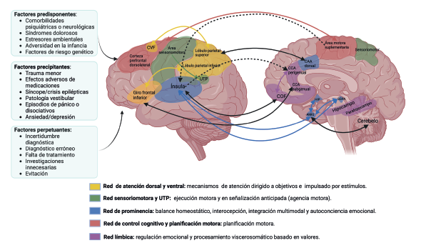 Las investigaciones por neuroimágenes han encontrado disfunción en redes cerebrales asociadas a la voluntad, la atención, el procesamiento emocional y el control motor 25, lo cual se refleja en una activación distinta de los patrones de conectividad entre la ínsula y las áreas asociativas parietales 26, y es un proceso que ocurre sin pasar por el control consciente 27. Adicionalmente, se han encontrado alteraciones en los centros relacionados con el sentido de agencia (experiencia de ser causante de las acciones propias), lo cual es un proceso de integración/retroalimentación sensoriomotora localizado en la unión temporoparietal (UTP), la corteza prefrontal y el cerebelo. Esto puede explicar la percepción de los síntomas funcionales como involuntarios, a pesar de que exhiban características de origen voluntario como la distractibilidad y la variabilidad 28. También se han encontrado alteraciones en la red de modo por defecto que interviene en la autorrepresentación y la agencia 29.