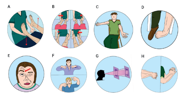 Nota: A. Signo de Hoover. B. Signo del abductor de la cadera. C. Caída sin pronación. D. Postura fija en inversión del tobillo. E. Distonía facial funcional. F. Pruebas de los dedos en ceguera binocular. G. Visión tubular H. Prueba de Bowlus-Currier.