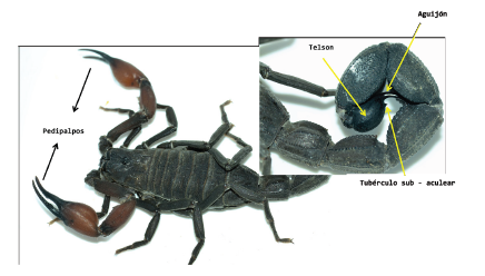 Nota: las especies venenosas suelen tener los pedipalpos delgados y, en el telson, ubicado detrás del aguijón, una apófisis denominada tubérculo subaculear. En la figura aparece un Tityus sabineae, macho.