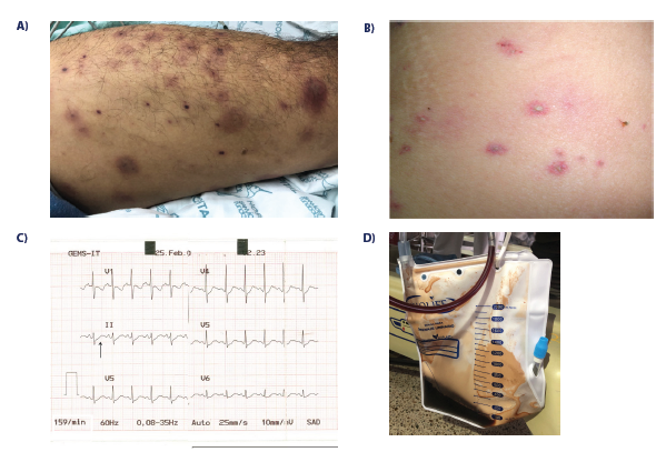 Figuras 3 Manifestaciones del ataque masivo por abejas. 3A. Lesiones cutáneas de aspecto violáceo en un paciente que sufrió un ataque masivo por abejas; 3B. Lesiones eritematosas, papulares y con aguijón de abeja adherido a la piel, con el saco venenoso seco, en un paciente que sufrió un ataque masivo por abejas; 3C. Electrocardiograma de un paciente que sufrió un ataque masivo por abejas, en el cual se aprecian taquicardia sinusal y cambios en el segmento ST; 3D. Orina hiperpigmentada, secundaria a rabdomiólisis, en paciente que sufrió un ataque masivo por abejas