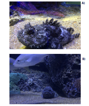 Figuras 5 Pez piedra. 5A. Vista lateral del pez piedra; 5B. Vista frontal del pez piedra