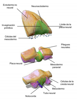 Las interacciones entre el ectodermo no neural (azul) y el mesendodermo (verde) con la placa neural (púrpura) inducen los márgenes de la placa neural (azul claro). A medida que avanza de tubo neural, la placa neural se enrolla y los márgenes de la placa neural se convierte en los pliegues neurales. Cerca del momento del cierre del tubo neural (dependiendo de la especie), las células de la cresta neural pasan por una transición epitelial a mesenquimal y migran a lo largo de las vías definidas.