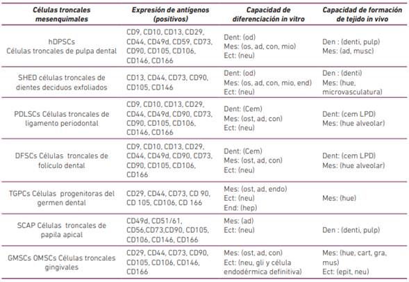 Linajes de diferenciación: dent (dentinogénico), mes (mesodérmico), ect (ectodérmico), end (endodermo), denti (dentina), pulp (pulpa) od (odontoblasto), os (osteoblasto), ad (adipocito), cho (condrocyte), mio (mioblasto), neu (célula neuronal), endo (célula endotelial), cem (cementoblasto), hep (hepatocito), musc (músculo) hue: (hueso) cem: (cemento) gra: (grasa), epit: (epitelio), gli: (glia) ND: no determinado. (Tabla modificada de Egusa et al., 2012).
