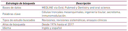 Se realizó una revisión bibliográfica hasta el 15 de mayo de 2017 bajo criterios específicos (Tabla 2). Se utilizaron las siguientes estrategias de búsqueda utilizando términos MeSH: (“Mesenchymal Stromal Cells”[Mesh] AND “Immunomodulation”[Mesh]), 804 resultados; (“Mesenchymal Stromal Cells”[Mesh] AND “Immunomodulation”[Mesh] AND “secretome”), 6 resultados; (“Tissue Engineering”[Mesh] AND “Mesenchymal Stromal Cells”[Mesh] AND “secretome”), 8 resultados; y (“Tissue Engineering”[Mesh] AND “Mesenchymal Stromal Cells”[Mesh] AND “secretome” AND “immunomodulation”), 1 artículo. Se eligieron 56 artículos por su relevancia para esta revisión.