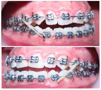 Figura 15 Fotografía octubre 9 de 2014. 8 meses de tratamiento arco MEAW de 0.016”x0.022”, se está centrando la línea media con elásticos cortos 3/16 de 4.5 onzas vector de clase III lado izquierdo en la foto y clase II lado derecho de la foto.