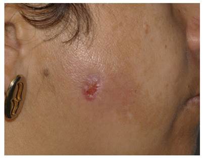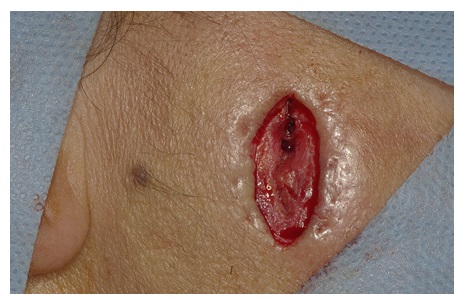 Intra oral physical examination revealed good oral hygiene, without periodontal disease or fistulous processes. There was not clinical sign of infection in the cicatrization process of the teeth sockets. In extra oral physical examination was observed an ulcerated fistula process in right parotid gland region (Figure 1), without deficit in facial expression muscles, pain on palpation of the affected gland but without apparent lesion or purulent secretions drainage through the fistula and orifice duct.