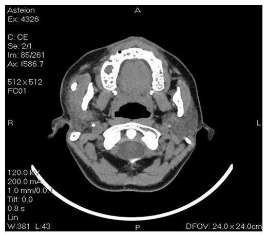 Computed tomography (CT) showed the presence of a spherical radiopaque image suggested a possible sialolith with diameter of approximately 12 mm, located superficially at the right parotid gland (Figure 2). During the initial evaluation, it was not observed the presence of this lesion in her panoramic radiograph.