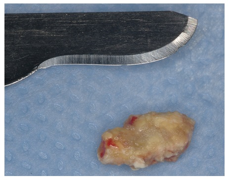 Sialolith exeresis was performed under local anesthesia through a skin incision with approximately 2 cm with careful dissection to avoid injuries to the glandular tissue and facial nerve preventing future salivary fistulas and facial paralysis (Figure 3). The anatomopathological exam revealed the presence of hard tissue, measuring 9x5x4 mm with an irregular shape; yellowish color (Figure 4) without the presence of salivary glands confirming the diagnosis of sialolith. After two weeks, in the prostoperative visit it was observed remission of the ulcerated fistula process; parotid gland with normal salivary function, permeable Stensen duct and without alterations of facial expression muscles.