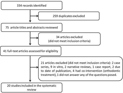 The search strategies yielded 334 articles; 259 duplicates were eliminated, leaving 75, for which titles and abstracts were reviewed. Thirty-four articles were excluded because they did not meet the inclusion criteria. Then, 41 full-text articles were evaluated, of which 21 failed to meet the inclusion criteria (Supporting information 4), leaving a total of 20 articles in the review (Figure 1. Article selection flowchart).