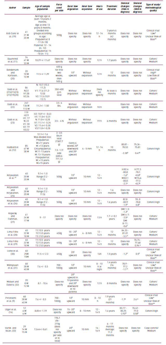 With the exception of the studies by Kirjavainen et al.7, Godt et al. 21-23, Ulger et al. 14, Lione et al.29 (which we will refer to here in after), it was unclear whether they performed any specific procedure to avoid a vertical effect; however, they mentioned using different outer bow angulations, which varied as follows: 0° 21-23, 10° upward 9,31, 15° upward 24,7,25,20,26, and 20° upward 33,30. Other authors did not report exact angulation, but rather a range from 10° to 20° 28,29) or 15° to 20° 14. Hubbard et al. 12 stated having used an angulation protocol of 20° upward and 20° downward, alternating them every 6 week, whereas Melsen and Dalstra 32 used an angulation of 20° upward in 10 individuals and 20° downward in 10 more individuals. Three studies 11,27,19 did not specify whether or not they used outer bow angulations.