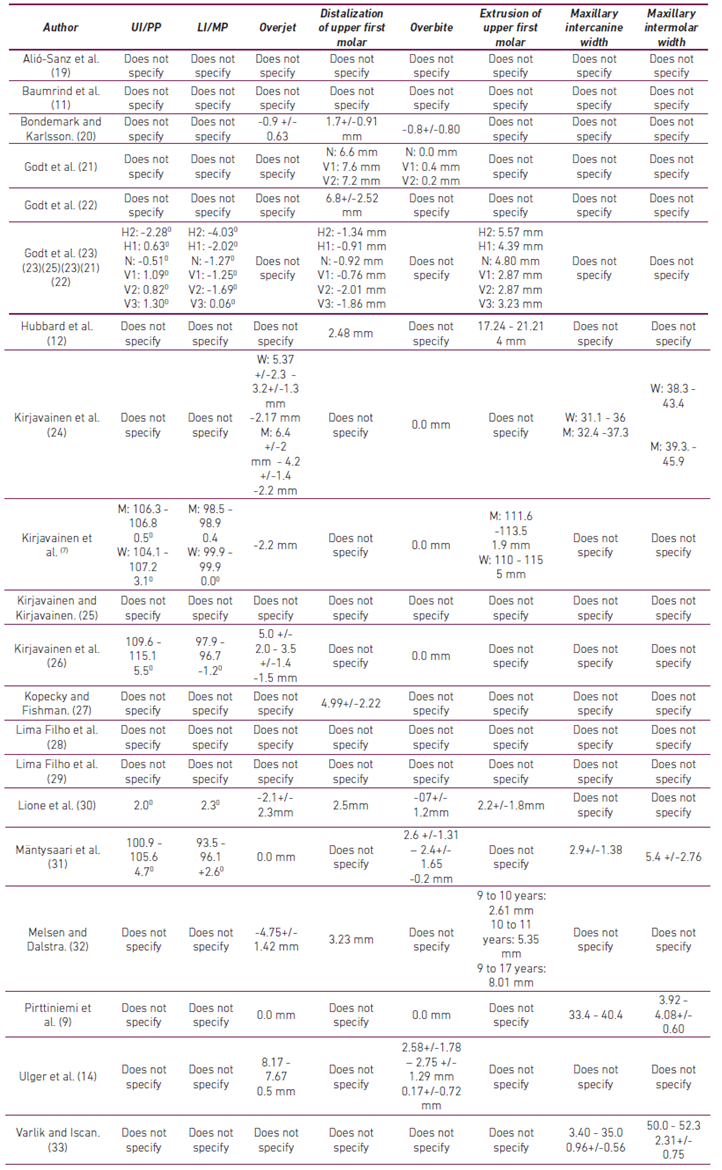 Nine of the studies analyzed reported changes in the SNA 27,12,7,29,31,9,14,26,30, which ranged from minimal maxillary retrusion changes of -0.6°, as reported by Kopecky and Fishman 27, up to retrusion changes as large as -3.3°, as reported by Lima Filho et al 29 (Table 1), after extraoral traction treatment compared to baseline measurement.