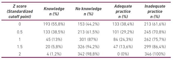 A total of 342 dentists, of which 114 were specialists and 228 general dentists in Colombia participated in this study. Participants completed a survey that included 19 questions on knowledge, attitude and practices in relation to BIONJ. The majority of participants (87.72%) reported that they knew the term, specifically 107 (93.85%) of specialists and 193 (84.65%) of general dentists. Cronbach’s alfa was used to measure internal consistency of the instrument (Table 1). It is important to highlight that domain 2 (attitudes) presented low Cα value (< 0.700) indicating a weak relationship among questions in this domain, therefore was eliminated from the analysis (7). The level of knowledge and practices of general and dental specialist dentists of BIONJ according to a Z-score, where Z=0 was defined as adequate is shown in Table 2.