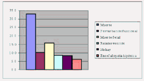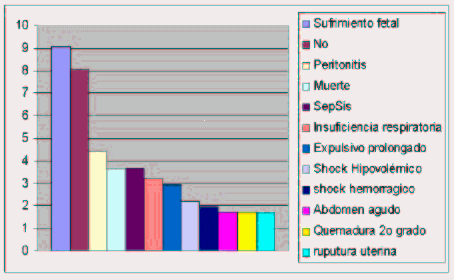 El sufrimiento fetal agudo constituye la complicación más frecuente, seguida por la NO presencia de éstas. Las demás posiciones están ocupadas respectivamente por peritonitis, muerte, sepsis, etc. La presentación de complicaciones no sugiere la existencia de error médico. No se puede olvidar que existen situaciones clínicas que a pesar de un manejo adecuado continúan su curso. Sin embargo no se debe pasar por alto las pautas de manejo universalmente aceptadas - lex artis (3)- que deben ser adoptadas para evitar la presencia de complicaciones o daños (Figura 11).