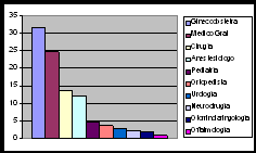 La observación de los procesos evidencia que no hay una especialidad exenta del problema. Existen algunas con mayor riesgo de demandas como: ginecoobstetricia, medicina general, cirugía general y anestesiología (Figura 2).
