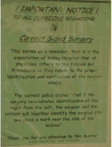 Los artículos que con mayor frecuencia se violan de la ley de ética médica comprenden los relacionados con la dedicación de tiempo suficiente al paciente, la calidad de la historia clínica y el sometimiento a riesgos injustificados. El profesional debe tener en cuenta que un mal resultado incluyendo la muerte no es lo que se espera de una atención. Los familiares o el paciente tienen derecho a saber si se hicieron todos los esfuerzos para alcanzar un desenlace satisfactorio. En Estados Unidos 40% de los médicos se ve involucrado en procesos de responsabilidad durante su práctica profesional (6). Si bien es cierto que errar es humano, también lo es el hecho de adoptar las medidas y precauciones para que no se presenten equivocaciones; un ejemplo de ello es el que se ilustra a continuación. La foto de este aviso en inglés, fue tomada por uno de los autores en una sala de cirugía en Las Vegas -USA-, en este, el jefe de cirugía recomienda a los cirujanos revisar nuevamente el paciente y la historia clínica antes de iniciar la intervención quirúrgica, para marcar con tinta indeleble el lado a operar (Figura 22).