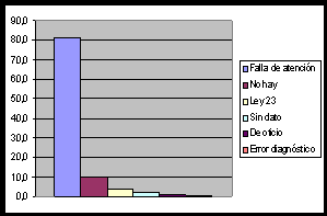 En 80% de los casos la demanda es instaurada por el paciente o familiares argumentando una falla de atención. Esta cifra no corresponde a la situación real, como se muestra más adelante en el comentario relacionado con error médico. El segundo porcentaje se deriva de procesos en donde no está claramente establecido cuál es el motivo de demanda. Se presentan también demandas en donde no se evidencia falla de atención por parte del profesional, pero sí por parte de la institución o del personal de salud y en una minoría se reclama violación a ley 23 de 1981 - Ley de ética médica - y procesos de oficio (Figura 6).