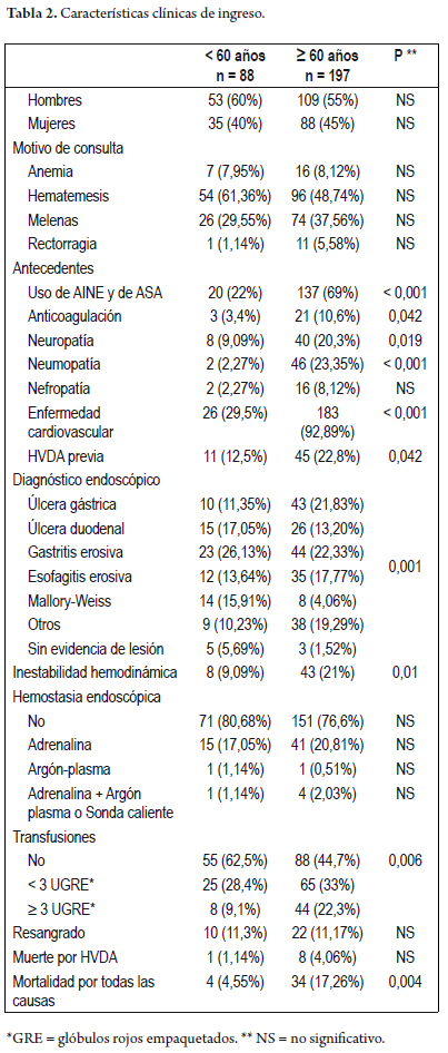 Se atendió a 385 pacientes; de ellos 100 fueron excluidos, pues presentaban hemorragia secundaria a várices esofágicas, historia clínica incompleta y hemorragia digestiva baja, para un total de 285 pacientes analizados. El 56,8% (n = 162) eran hombres; el 30,9%, menores de 60 años, y el 69,1%, mayores de 60 años.