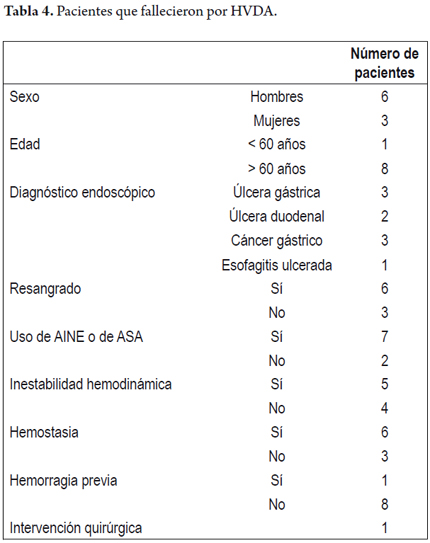 Entre los individuos que fallecieron, 9 (24%) correspondieron a casos cuya muerte tuvo como causa principal la HVDA; 8 de ellos eran personas mayores de 60 años, y un paciente más requirió manejo quirúrgico de urgencia, debido a una úlcera duodenal perforada. Las restantes 29 personas fallecieron por causas relacionadas con la HVDA, en conjunto con otras complicaciones asociadas a su patología de base (tabla 4).