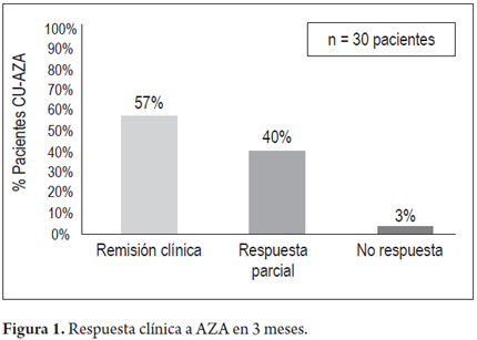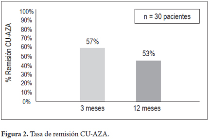 Conclusiones: este estudio demuestra una tasa de remisión clínica de 53% con AZA en CU leve a moderada al año de seguimiento, logrando suspender esteroides en el 53% de los pacientes. AZA es una opción terapéutica de bajo costo y segura, que puede considerarse en este grupo de pacientes previo al inicio de terapia biológica.