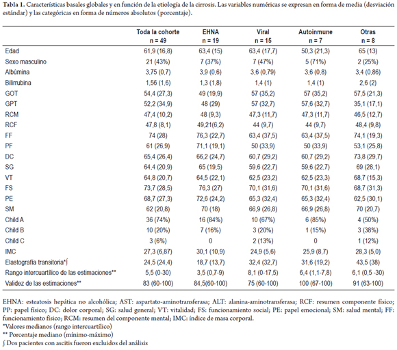 Pacientes y métodos: estudio transversal analítico realizado desde el 01 de Junio de 2014 hasta el 31 de Agosto de 2014. Se evaluaron de forma consecutiva a 49 pacientes con cirrosis hepática a través de la encuesta SF-36 V2 en su versión en castellano y se recolectó información epidemiológica, clínica y analítica actualizada a la fecha de inclusión en el estudio. Para identificar los factores determinantes de la calidad de vida se realizó inicialmente un análisis univariante utilizando la t-student para comparación de medias en el caso de variables independientes dicotómicas y el coeficiente de correlación de Pearson en el caso de variables independientes numéricas. La relación se consideró estadísticamente significativa con un p <0,05.