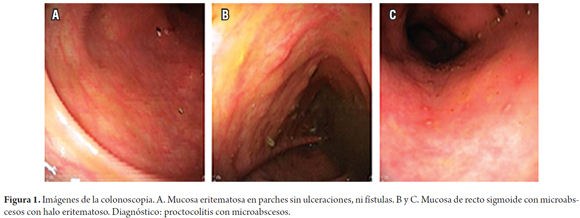 Paciente de género masculino de 7 años de edad, procedente de Bogotá, con cuadro clínico de 2 meses de evolución luego del uso de antibiótico (cefuroxima 30 mg/kg/día por 10 días) por rinosinusitis. El cuadro inició con deposiciones diarreicas con moco y pintas de sangre, no explosivas, por 2 días; luego pasó a deposiciones Bristol tipo 5 y 6. Consultó al servicio de urgencias de una institución local, donde iniciaron manejo ambulatorio con suero oral y probióticos (bifidobacterias y lactobacilos vivos liofilizados) sin mejoría. Fue revalorado a los 7 días, con toma de coproscópico que evidenció trofozoitos de Entamoeba histolyitica/dispar, por lo que diagnosticaron amebiasis e iniciaron tratamiento con metronidazol (30 mg/kg/día por 7 días) y nifuroxazida (5 mg/kg/día por 7 días). El paciente persiste sin mejoría, por lo que fue hospitalizado e implementan ácido nalidíxico (50 mg/kg/día por 7 días), hidratación endovenosa y Bacillus clausii por vía oral. Después de 3 días del inicio del tratamiento aparecen membranas blanquecinas en heces. Se hicieron estudios para descartar infección por CD, resultando positivo para toxinas A y B; también se practicó una colonoscopia. Presentó un episodio febril a las 24 horas del procedimiento, por lo que prescribieron metronidazol (30 mg/kg/día por 7 días) y ampicilina (100 mg/kg/día por 7 días), completando 10 días de tratamiento. Al egreso hospitalario se indicó manejo con simbiótico (bifidobacterias, lactobacilos, inulina y fructooligosacáridos) y metronidazol; presentó una nueva recaída a los 5 días, por lo que se decide toma de coproscópico que no reportó microorganismos y se manejó con oxantel y pirantel (10 mg/kg/día por 3 días).