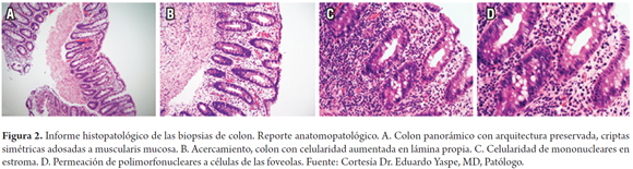 El paciente consultó a Gastronutriped 2 meses después del inicio de su cuadro clínico. Dos días previos a la consulta había presentado deposición Bristol 6, escasa, con tenesmo y pintas de sangre, sin presencia de otros síntomas, en manejo con Saccharomyces boulardii (250 mg cada 12 horas); se evidenció desnutrición aguda. Se consideró como diagnósticos colitis por CD y síndrome posenteritis debido a la diarrea persistente; se indicó gluconato de zinc (libre de azúcares), L-glutamina y Lactobacillus reuteri, suplemento proteico, y se continuó con Saccharomyces boulardii. Se empezaron estudios para EII y FQ. A los 8 días de la primera consulta en Gastronutriped reapareció la diarrea, con moco y sangre por 4 días, sin fiebre ni compromiso general; consultó al servicio de urgencias, le indicaron manejo ambulatorio con suero oral y diosmectita, continuando con Saccharomyces boulardii. En el control, a los 24 días de la primera consulta en Gastronutriped, se evidenció resolución de los síntomas y ganancia de peso; presentaba síntomas sugerentes de estreñimiento, por lo que se prescribió polietilenglicol sin electrolitos y se dieron recomendaciones nutricionales. Entre los laboratorios solicitados se observó calprotectina fecal positiva (>300 µg/gr), por lo que se sospechó EII. Otros estudios realizados se presentan en la tabla 2.