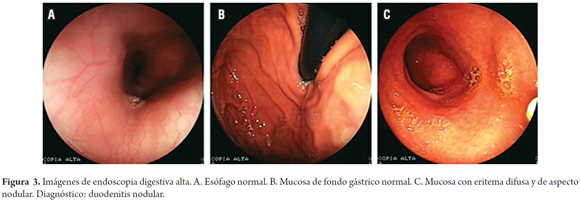 En un nuevo control, alrededor de 6 meses después de la primera consulta en Gastronutriped, la calprotectina fecal persistió positiva (>300 µg/gr), por lo que se decide realizar una endoscopia digestiva alta y colonoscopia (figuras 1 y 2). En las biopsias de la endoscopia digestiva alta (figura 3) se reportó: esofagitis grado I, gastritis crónica moderada con cambios reactivos foveolares, Helicobacter pylori negativo y duodenitis grado I; por lo anterior, se inició manejo con omeprazol 20 mg cada 12 horas por 3 meses. El paciente tuvo una evolución favorable, sin sintomatología gastrointestinal y en una nueva valoración (alrededor de 7 meses y medio desde el comienzo del cuadro), la calprotectina fecal resultó negativa. Se descartaron FQ y EII.