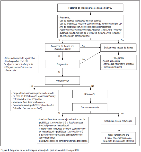 Como primer paso en el tratamiento, la Academia Americana de Pediatría recomienda suspender el antibiótico que llevó al episodio (37), con este manejo, hasta en un tercio de los casos el cuadro mejorará (38); si se presenta deshidratación, apariencia tóxica y enfermedad severa, se debe iniciar la hospitalización (39). Como manejo antibiótico, en un primer episodio se sugiere iniciar metronidazol; en los casos de una primera recurrencia, los niños con síntomas leves se pueden manejar de forma conservadora sin manejo antibiótico (40), aquellos con cuadro moderado a severo suelen responder a un segundo curso del mismo tratamiento (metronidazol) o uso de vancomicina (40). En casos de una segunda (o tercera) recurrencia o cuando se decida terapia prolongada, se recomienda siempre uso de vancomicina (40); en casos de recurrencia después de este último régimen, se han descrito beneficios con el uso de trasplante de microbiota fecal (41-44), mostrando tasas de curación de 91% a 98%; sin embargo, todavía se debe determinar la ruta óptima de administración, y la evidencia es insuficiente respecto de las consecuencias y/o complicaciones de este trasplante fecal A corto y largo plazo, algunos han reportado colitis inflamatoria después del trasplante (45). En los casos-estudio, los pacientes presentaron recaída luego de la implementación del tratamiento, de hecho, la paciente del caso 1 requirió vancomicina oral. En este artículo se propone un algoritmo para el diagnóstico y tratamiento de la infección por CD (figura 4).