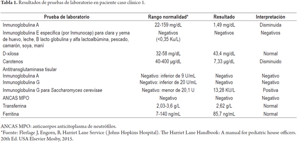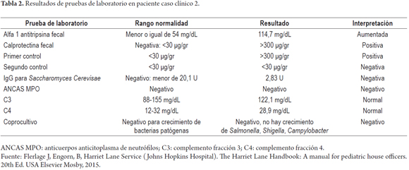 Al término del tratamiento antibiótico presentó una nueva recaída, con deposiciones tipo Bristol 6 y 7; se indicó continuar con probióticos y zinc, sin nueva terapia antibiótica. Como hallazgos de los laboratorios se encontraron toxinas A y B para CD negativas y ASCAS (inmunoglobulina G para Saccharomyces cerevisae) positivos, por lo que se indicó endoscopia digestiva alta. No fue posible la colonoscopia porque los padres no autorizaron el procedimiento. Otros estudios realizados se presentan en la tabla 1. En el último control, a las 12 semanas de la primera valoración en Gastronutriped, la paciente presentaba adecuada evolución, seguían pendientes los estudios para descartar FQ (elastasa fecal pancreática y electrolitos en sudor) y se indicó seguir con Saccharomyces boulardii, 200 mg cada 12 horas, hasta completar 3 meses.