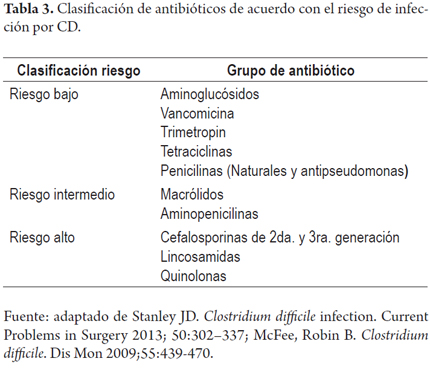 Los factores de riesgo predisponentes para el desarrollo, persistencia y RCD son múltiples, la exposición a la antibioticoterapia es el factor de riesgo independiente más importante para la infección, tanto en nivel comunitario como asociado con el cuidado de la salud (20-22), y de acuerdo con el tipo de antibiótico, el riesgo de presentación varía (tabla 3). El uso de agentes supresores de ácido gástrico es otro factor de riesgo (23, 24); sin embargo, este tópico aún está en revisión. Estudios han evaluado el efecto de estos medicamentos en niños con infección por CD, encontrando que el 10,4% presentaron recurrencia de la infección, siendo la recaída más frecuente cuando estaban con manejo concomitante con estos agentes (25). Otros factores de riesgo para la infección de CD que se mencionan son: hospitalización previa, procedimientos quirúrgicos previos, inmunosupresión, y uso de sondas oronasogástricas (24). Dentro de los factores asociados con RCD se mencionan: severidad de la enfermedad, edades extremas en los pacientes, y antibioticoterapia paralela por otra infección (1). Los casos expuestos en este artículo tuvieron recurrencia de la enfermedad pero no presentaron estos factores de riesgo.