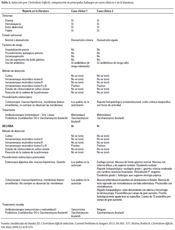 La endoscopia digestiva rara vez se utiliza para diagnosticar la infección por CD, además que puede conllevar complicaciones, sin embargo, puede estar justificada en situaciones de urgencia, cuando se sospeche infección y las pruebas de heces sean negativas (27, 33). En niños con diarrea crónica y con alteración del estado nutricional es importante evaluar malabsorción intestinal y descartar otros diagnósticos diferenciales, tal como se hizo en los pacientes-estudio (34). Se ha evaluado la calprotectina fecal dado que es uno de los biomarcadores más estables y proporciona información sobre el estado inflamatorio del intestino, es de gran utilidad para el seguimiento y para predecir recaídas en algunas patologías de origen inflamatorio (35); inicialmente, se describió para EII y en la actualidad, comienza a implementarse en otras patologías (36). En el caso 2, la calprotectina fecal estaba aumentada, aspecto que determinó su seguimiento, en concordancia con lo anterior, este paciente presentó un resultado positivo probablemente por la colitis por el CD y no porque padeciera EII. Sin embargo, faltan estudios para determinar la sensibilidad, la especificidad y la utilidad de este estudio en pacientes con infección por CD. En la tabla 5 se presenta la comparación de principales hallazgos en los casos clínicos y lo reportado en la literatura.