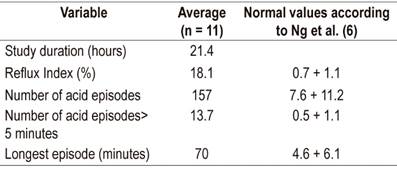 More than half of the preterm infants studied in the Newborn Intensive Care Unit of the HUV of Cali, Colombia had abnormal pH. These data are very similar to those described by Di Fiore et al. 14 who reported that 59.0% of their study participants had GERD diagnosed by pHm. The percentage diagnosed with GERD in our study was greater than the percentages identified Sivalingam et al., Rossor et al. and of Funderburk et al. who found of 30.0%, 21.0%, and 10.0% respectively using MII. 13,15,16