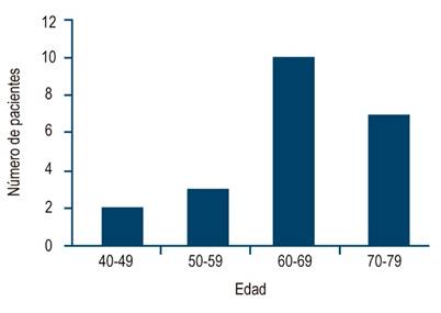 Figura 3 Edad de pacientes con EB. En el eje X se observan los rangos de edad: 40 a 49, 50 a 59, 60 a 69 y 70 a 79 años.