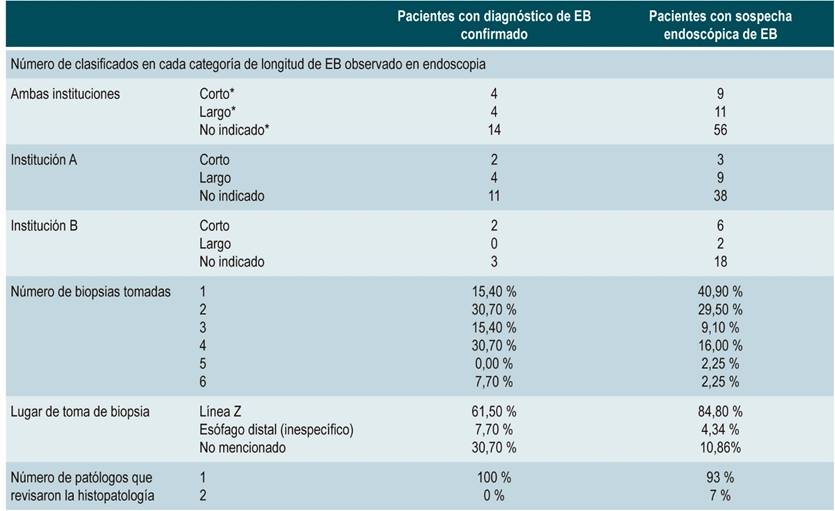Todo ello podría sugerir que las características endoscópicas del EB no son muy predictivas para el diagnóstico, que estas son muy variables (que se tratan del EB de segmento corto o incluso focal, lo cual dificulta una toma de biopsia precisa) o bien que no se ha tomado un número adecuado de biopsias en relación con el tamaño del posible EB observado (dato que no podemos conocer con certeza, puesto que en el 63 % no se mencionó la longitud del segmento observado).