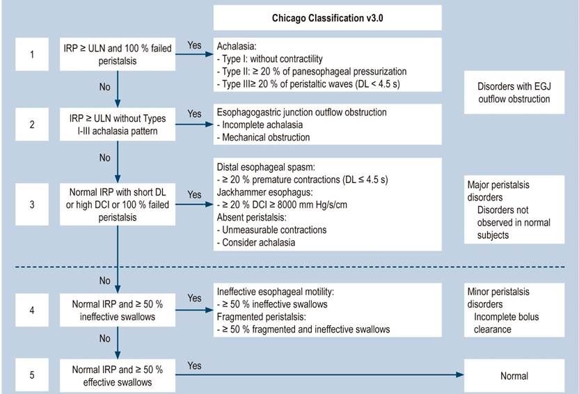 Figure 6 Algorithm for the interpretation of esophageal HRM according to the Chicago Classification v3.015. Taken from: Hani A et al. Rev Colomb Gastroenterol. 2017;32(4):369-378.